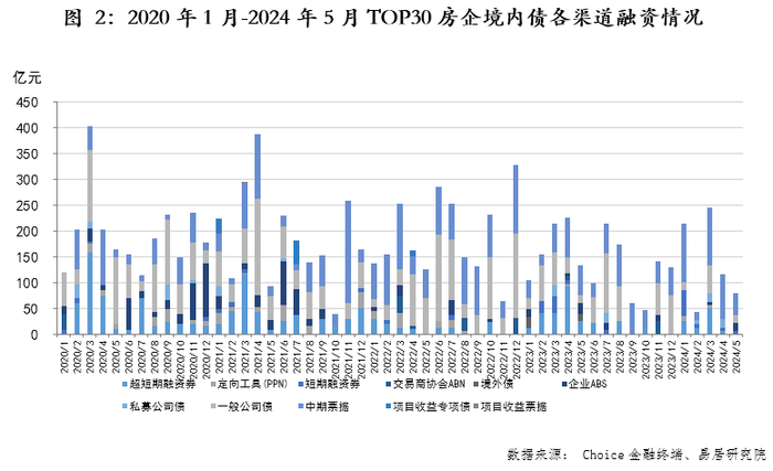 2024年5月,TOP30房企境内债发行总额为80亿元,环比下降48.2%,同比下降40.5%。从融资渠道看,中期票据占比过半,其次是一般公司债和企业ABS,分别占20%左右,三者合计占九成。