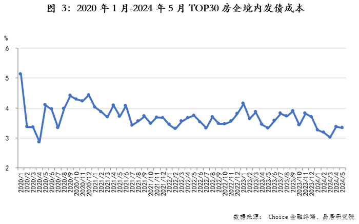 2024年5月TOP30房企境内债成本为3.34%,环比下降3.9pts。