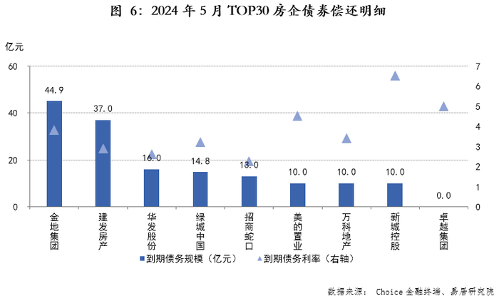 5月TOP30房企中6家发行了新债,其中民企及混合制企业过半,民企融资环境有所优化。保利发展、建发房产发行了35亿元,利率在2.5-3%之间,万科、新城、绿城和滨江合计发行了华发股份发行了45亿元,利率在3.5%以上;民企美的置业和滨江集团发行了27亿元。债务到期方面,5月TOP30房企中有9家债务到期,也是民企占大头。新城、绿城、建发本月新发债利率低于债务到期利率,以低利率替换高利率债务,有效缓解了偿债压力。