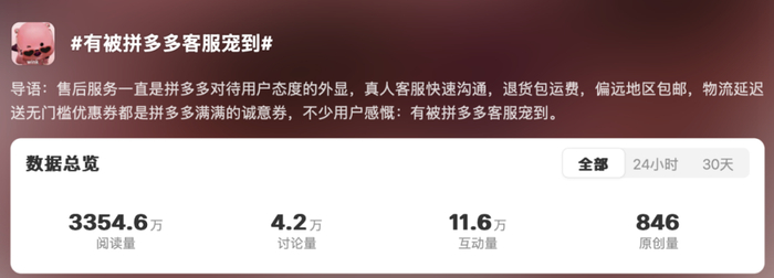 在热搜话题#有被拼多多客服宠到#下,有很多与小阔相似的经历,有用户收到实物与图片色差较大的穿戴甲,正当商家试图扯皮时,拼多多客服及时介入,快速处理;有消费者的退货运费超了2元,拼多多客服追着表示退货运费全包,不仅要退返2元运费,还补偿一张无门槛消费券;有用户购物需求有变,要求拦截快递时,拼多多客服的速度比商家还快……