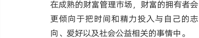 事实上,在成熟的财富管理市场,财富的拥有者会更倾向于把时间和精力投入与自己的志向、爱好以及社会公益相关的事情中。