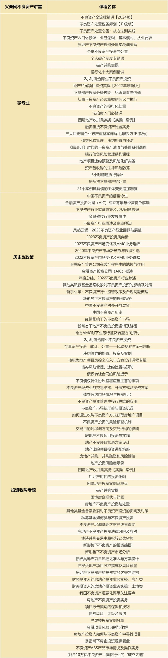 除了《房地产不良资产投资处置实战训练营》之外,火栗网共拥有16000分钟、400+课时专业线上课程