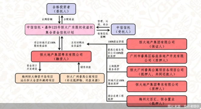 早在2020年6月,中信信托发行了“嘉和125号恒大信托计划”。项目保证人为恒大,项目融资主体为恒大地产集团粤东有限公司,募集资金用于开发建设恒大御景半岛项目和恒大金碧外滩湾项目,收益来源为恒大广州番禺公寓项目的销售收入。