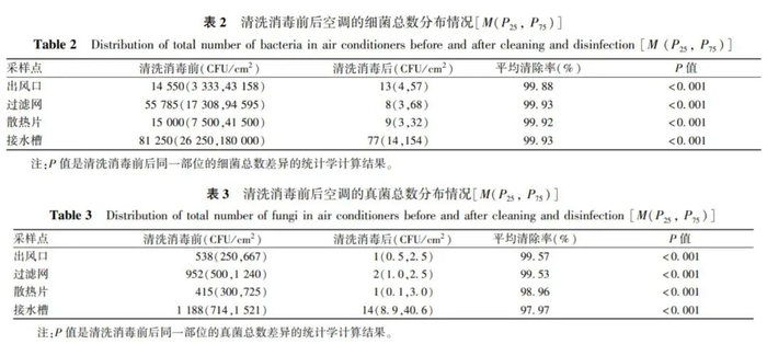 由于目前国内外尚无家用空调卫生规范,参考《公共场所集中空调通风系统卫生规范》(WS394—2012)规定的集中空调风管内表面细菌总数和真菌总数均需要≤100CFU/cm²,可以看出研究中的家用空调四个部位的细菌总数和真菌总数超出标准值1.5~2810倍。