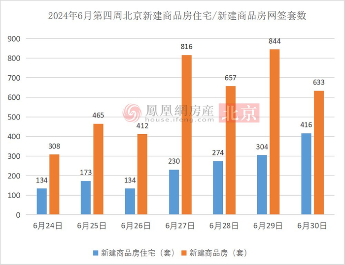 本周(6月24日至6月30日)北京市场新建商品房网签4135套,环比上涨91.26%;面积约43.75万平方米,环比上涨147.93%。其中,新建商品房住宅网签1665套,环比上涨70.07%;成交面积约22.27万平方米,环比上涨95.03%。单日网签方面,6月30日最高,新建商品房住宅网签套数为416套。