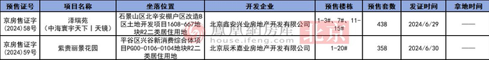 紫贵丽景花园获证编号为京房售证字(2024)59号,共计20栋住宅楼,涉及358套房源,准许销售面积4.66万㎡。