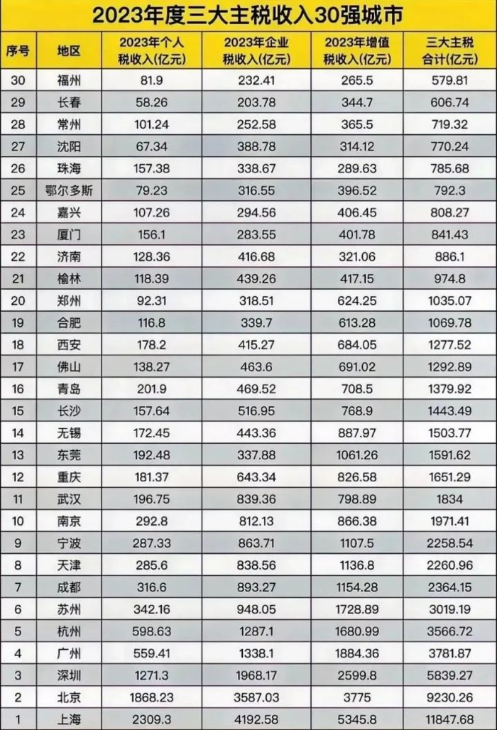 也有观点认为,相比GDP,税收数据不好弄虚作假,可以从这个维度去了解各地的真实经济实力。比方说个人所得税、企业税、增值税,这三大主税种更能直观体现本地企业和个人的发展水平,能够更精准地反映经济冷热。