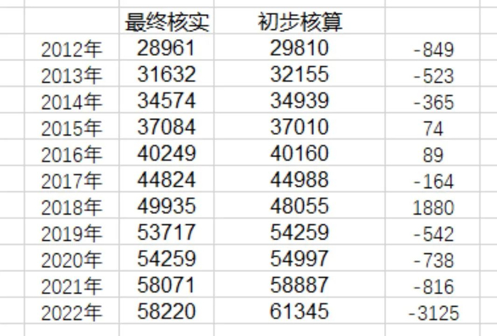 就拿2022年来说,全国GDP最终核实数据为12047424亿元,比初步核算值足足少了5483亿。