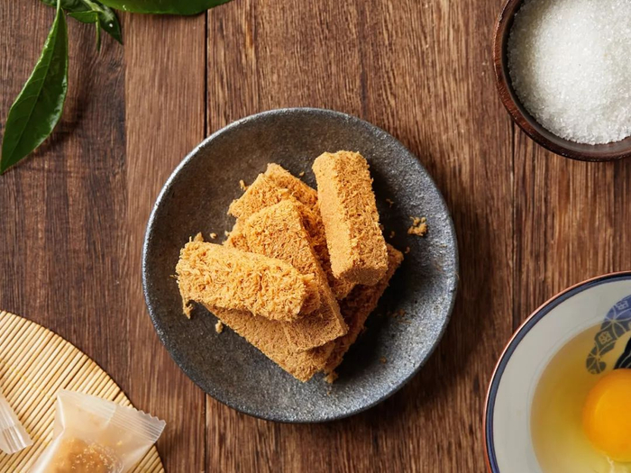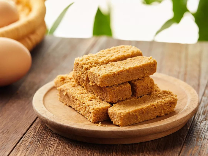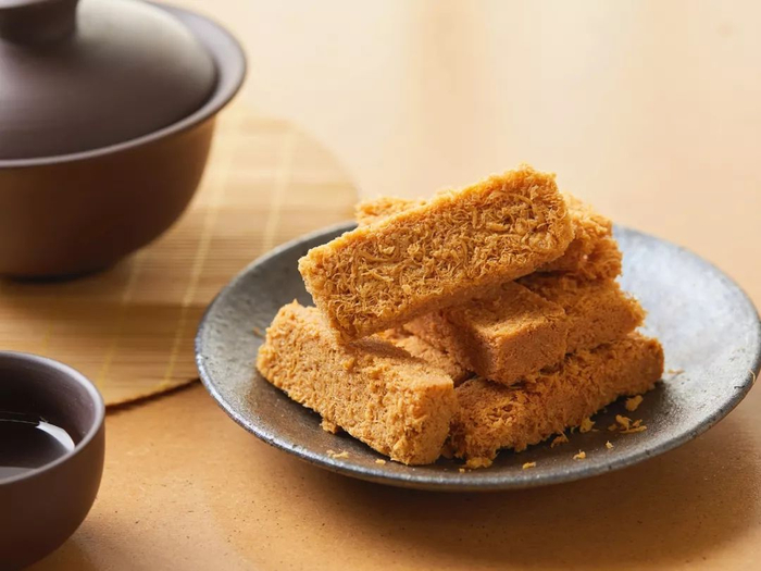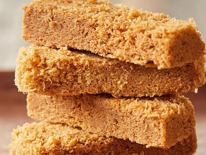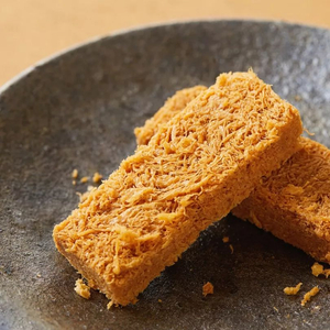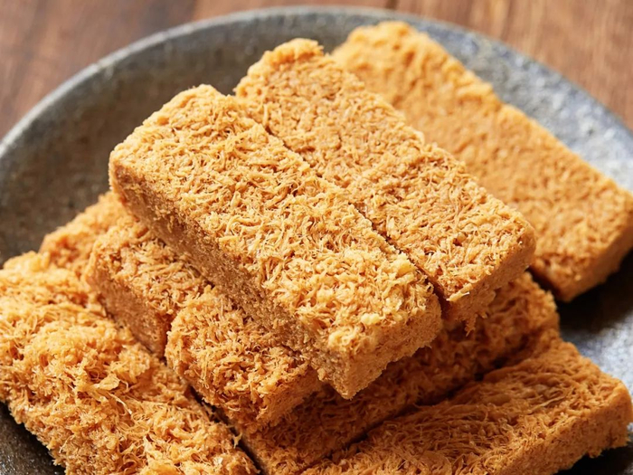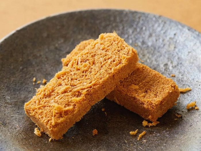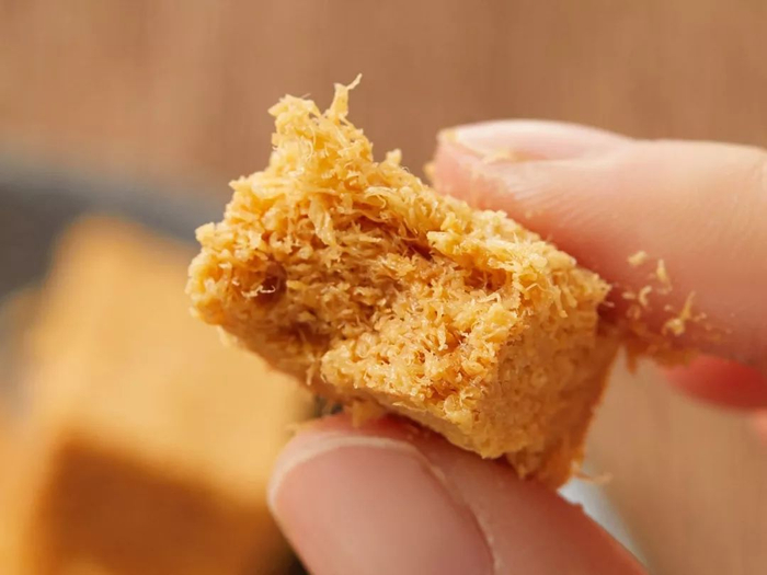 炸好的蛋酥,还要放进烤箱微微烤制一下,使其更加酥脆。然后重力压制成形,并切成小块。