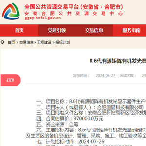 此外,根据全国公共资源交易平台(安徽省,合肥市)发布的最新招标计划,合肥国显科技有限公司已于日前发布“8.6代有源矩阵有机发光显示器件生产线项目EPC总承包”招标,合同股价为97亿元,主要完成本项目生产厂房、相关配套设施及生活区的各阶段设计、管理、采购、施工、竣工验收等全过程内容。计划招标时间:2024-07-26。