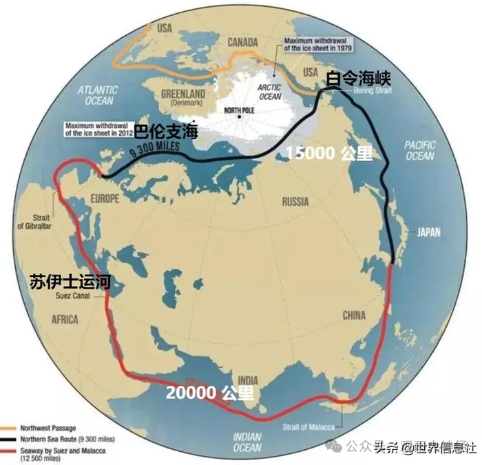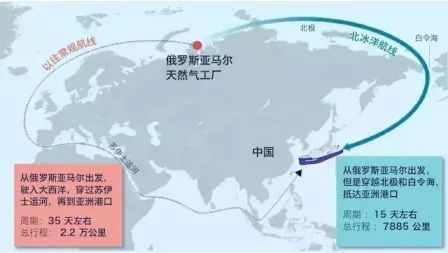 从俄罗斯最大的天然气产区亚马尔半岛出发去往中国,北极航线的路程只有传统航线的三分之一,能节省的时间长达20天。