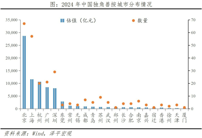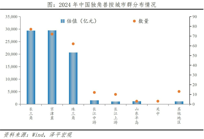 独角兽集中于五大城市:北京、上海、杭州、广州、深圳。2024年七城独角兽数量占整体比例达67.2%、估值占比达80.1%。从区域省份看,长三角、珠三角、京津冀地区是独角兽第一梯队,在数量和规模上领先;长江中游城市群、长江上游城市群、山东半岛城市群、关中城市群是独角兽发展的后备力量。