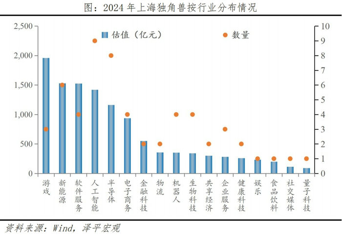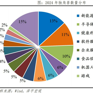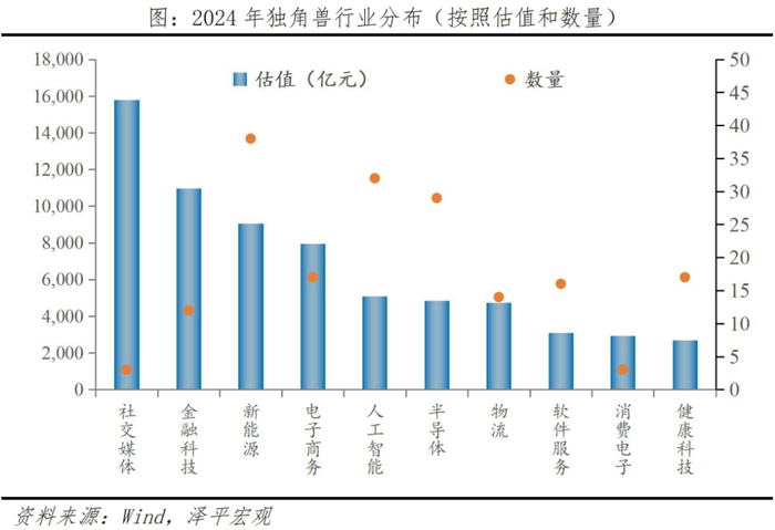 新能源、人工智能、半导体行业独角兽数量最多,分别为38家、32家、29家,总估值分别9056亿、5093亿、4859亿。