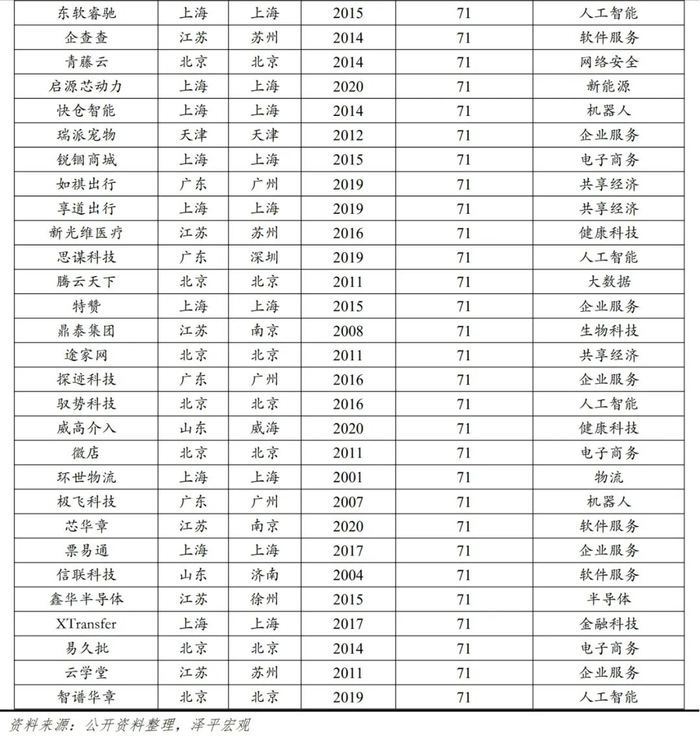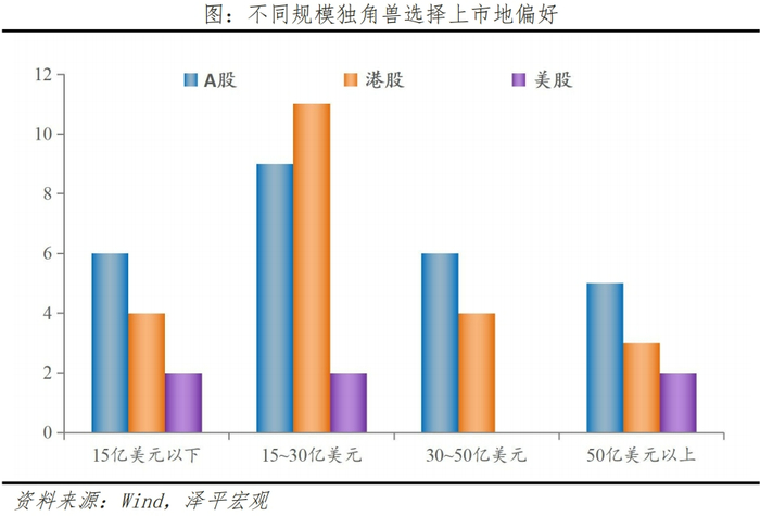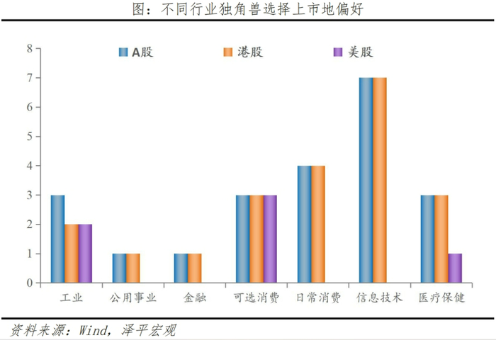 从企业来看,美股上市独角兽市值最高,平均市值34.95亿美元;A股其次,平均市值30.8亿美元;港股与A股基本持平,平均市值30.5亿美元。从规模看,15~30亿美元估值的中型独角兽更青睐香港上市,其他规模的独角兽更偏好A股上市。从行业看,不同领域独角兽对A股和港股上市偏好不明显,美股上市独角兽主要是制造业和可选消费行业,值得注意的是,信息技术类独角兽没有在美上市。