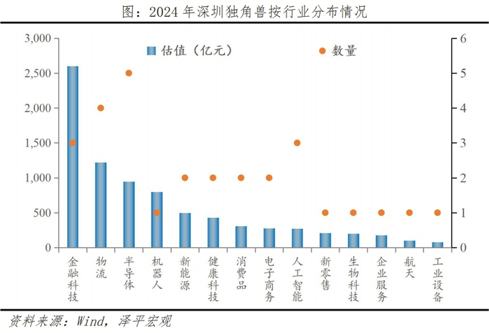 深圳独角兽共29家,数量占比10.1%,总估值8119亿元,占比9.6%。金融科技、半导体、物流三大行业的独角兽数量分别占17.2%、13.7%、10.3%。深圳的优势在于投融资市场成熟,企业IPO相对周期短,因此过去的独角兽企业上市的多、存量独角兽企业数量相对少。比如,人形机器人领域的优必选在2023年成功上市港交所,激光雷达独角兽速腾聚创也已向港交所提交招股书。