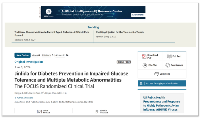 6月初,以岭药业生产的创新中药津力达颗粒循证研究论文《津力达对糖耐量异常合并多代谢紊乱人群的糖尿病预防效果——FOCUS随机临床试验》又在国际权威医学期刊《美国医学会杂志·内科学》(JAMA Internal Medicine,影响因子39)发表。论文介绍了津力达干预代谢综合征糖耐量异常人群取得的重大成果——津力达可降低糖耐量异常合并多代谢紊乱人群罹患糖尿病的风险,为糖尿病的预防提供了新的视角和策略。
