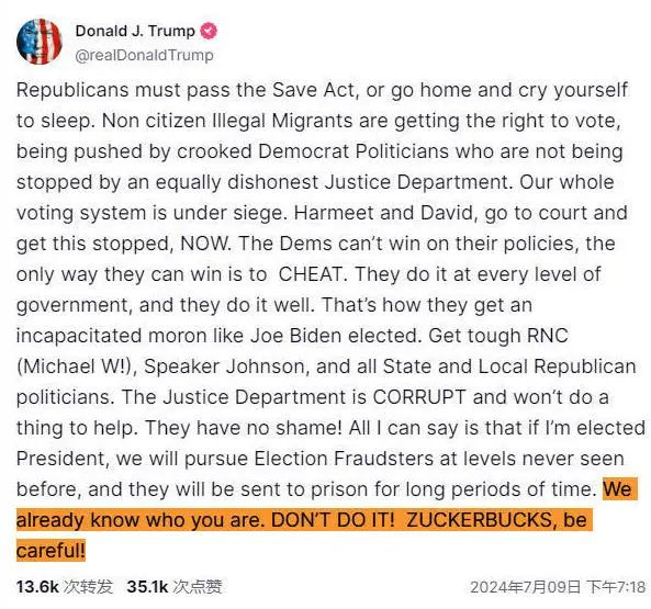 就在几天前,特朗普还在威胁把扎克伯格送进监狱。他在自己的社交媒体Trurth Social上表示:“我只能说,如果我当选总统,我们将以前所未有的力度追查选举舞弊者,把他们送进监狱,牢底坐穿。我已经知道你们是谁,别这么做,ZUCKERBUCKS,给我小心点!”外界分析,这可能是Meta解禁特朗普社交账号的原因之一。