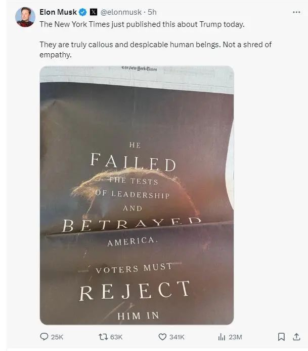 一向支持民主党的马斯克这次公开声援,甚至将其与西奥多·罗斯福相提并论,后者被普遍认为是历史上的伟大总体。马斯克不光支持,还在驳斥反对的声音,7月14日,《纽约时报》发文抨击特朗普:“他(特朗普)没有通过领导力的考验,他背叛了美国。”此后又有消息称,马斯克已通过美国政治行动委员会向特朗普捐款,“金额相当大”。