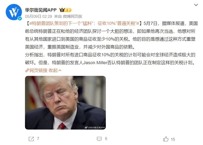 特朗普对关税武器的青睐早已众人皆知,这也将延续到他可能的第二任期。今年5月,据媒体报道,如果成功当选,特朗普想对所有从其他国家进口到美国的商品征收至少10%的关税。