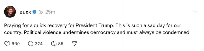 就连和特朗普矛盾剧烈的扎克伯格,也表达出了善意,他在自家的社交媒体平台Threads上表示:“祈祷特朗普总统能早日康复。这对我们的国家来说是非常悲伤的一天。政治暴力破坏民主,必须受到谴责。”