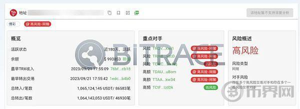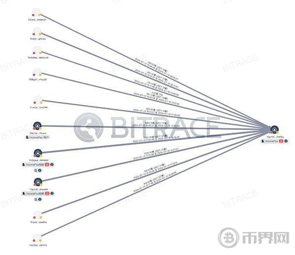 初步调查结果显示, TNVaKW 创建仅五天后,总资金交易规模便超过 10亿 USDT,收取了来自大量被标记为 HuionePayUser 的波场地址的存款,同时也收取来自其他 HuionePay 官方地址及 HuioneGuarantee 官方地址的资金。因此 Bitrace 确认该地址系 Huione 官方业务地址,并判断冻结原因为收取较大金额被盗加密资金。