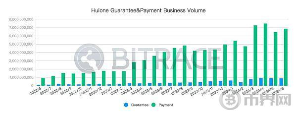 据 Bitrace 监测,2022 年 6 月至 2024 年 6 月之间,所有已知 HuionePay 与 Huione Guarantee 业务地址的月度资金规模一直维持上升趋势,从 2022 年 6 月最低 10.3 亿 USDT,到 2024 年 4 月最高 83.9 亿 USDT,两年间总资金规模达到 1023.97 亿 USDT。
