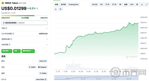 而 WEEX Token 当前价格为 $0.01299,CoinGecko 最早收录时间 2024 年 7 月 6 日,由于刚上线不久,市值、流通量、总供应量数据尚未被跟踪。