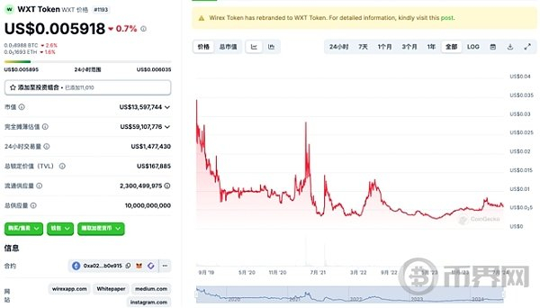 数据不会说谎,但要看权威平台的数据。以 CoinGecko 为例,我们看到 Wirex Token 当前币价为 $0.005918,流通市值 $13 M,FDV $59 M,被 CoinGecko 最早收录时间为 2019 年 7 月 2 日。