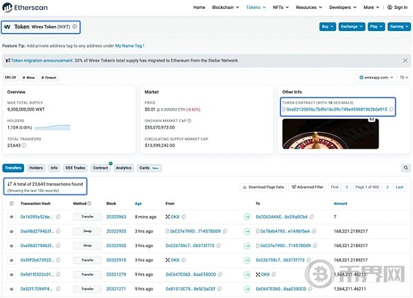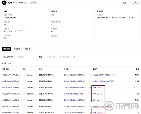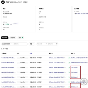 根据区块链浏览器查询显示,7 月 4 日- 15日,有 24 笔 WEEX Token (WXT) 代币被转到了标签为「OKX. User」的地址,另有一笔 WEEX Token 被转到了 Wirex Token (WXT) 的 DEX 地址。