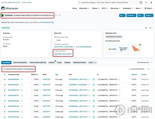 同时我们可以看到,Wirex Token 有 2 万多次转账交易,而 WEEX Token 只有 76 次。这是因为 WEEX Token 本月才上线,还没上 DEX,而 CEX 内部转账记录不会上链。