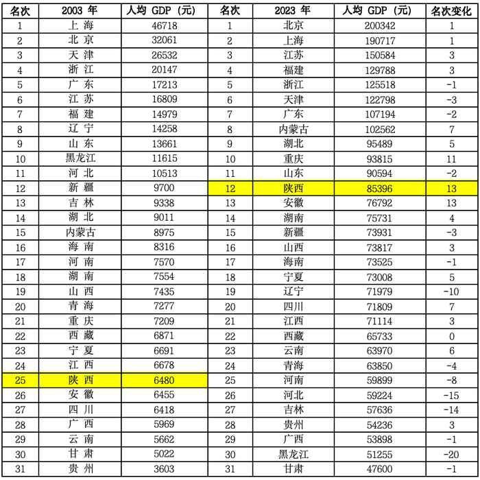 从人均GDP来看,2003~2023年,陕西从全国第25名上升到第12名,成为全国进步最大的省份。