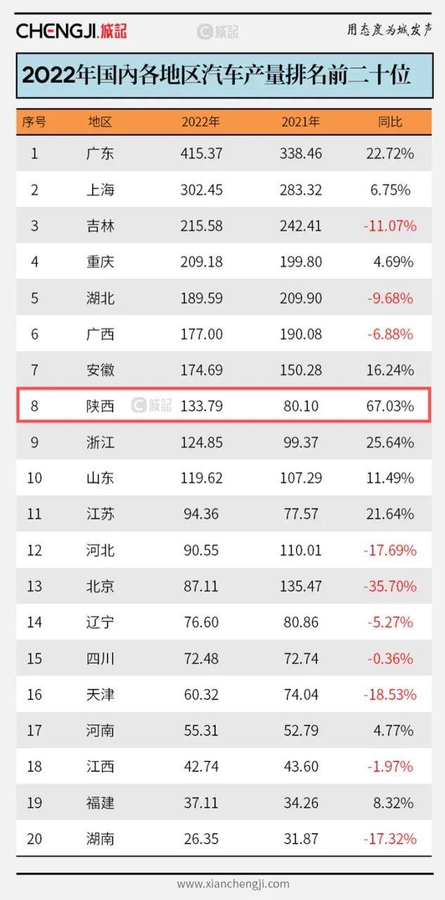 2022年,陕西汽车总产量达到133.8万辆,从2021年的全国第13位跃居至第8位,增速位列全国第一,其中新能源汽车产量更是位居全国第二。