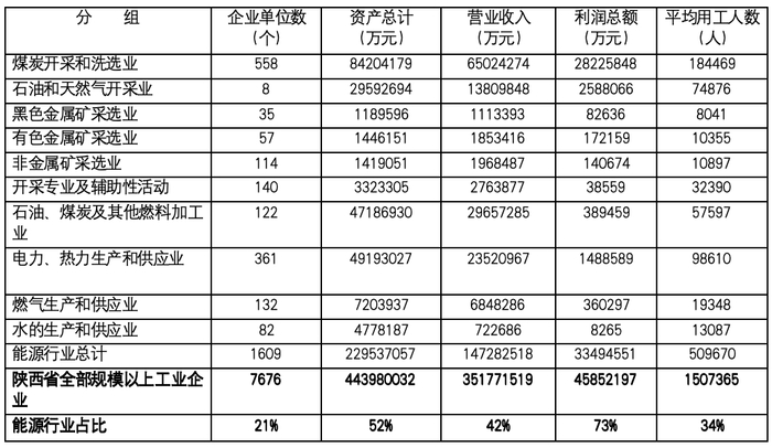 如果把电力、燃气、水生产和供应业也算是泛能源行业,陕西的能源企业数量仅占全省规模以上工业企业中的21%,却贡献了全省42%的营业收入,52%的总资产,73%的利润总额。