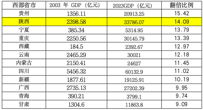 从GDP增长来看,最快是贵州,其次是陕西,2023年GDP相比2003年翻了14倍。