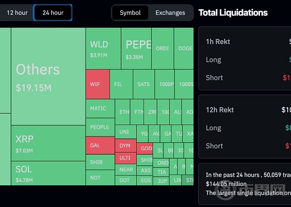 据CoinGlass数据显示,过去24小时,加密货币全网爆仓金额超1.44亿美元,有超过5万人遭清算,多头占1.07亿美元。