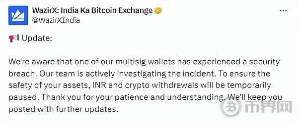 该交易所写道:“我们知道我们的一个多重签名钱包遇到了安全漏洞。我们的团队正在积极调查这起事件。为确保您的资产安全,印度卢比和加密货币提现将暂停。感谢您的耐心与理解。我们将随时向您通报进一步的更新。”