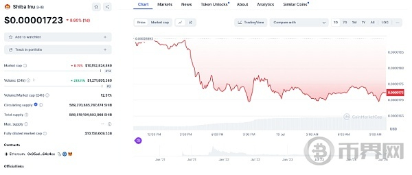 利空消息传出后,柴犬币日内大跌8.80%,报在0.00001723美元。