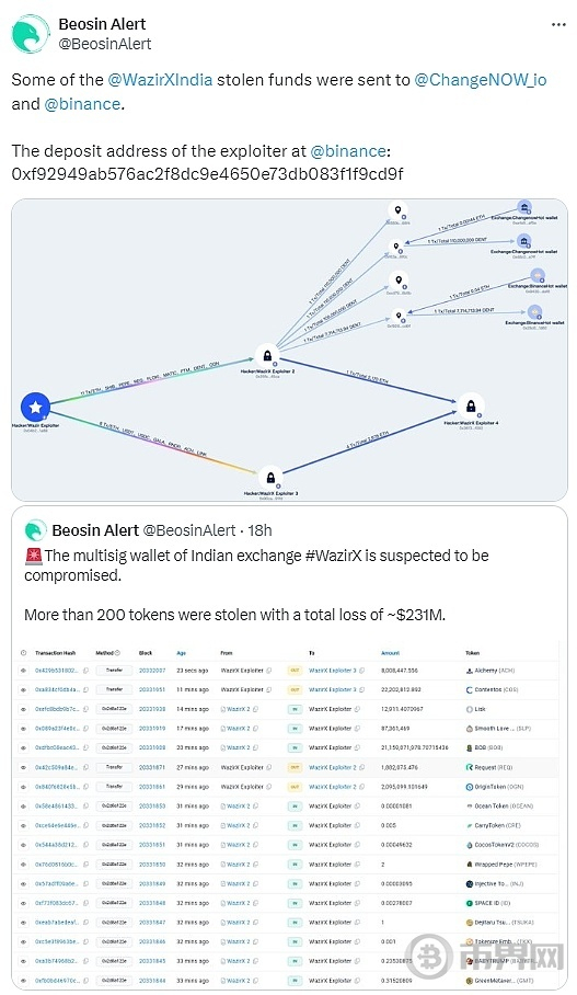 印度最大交易所WazirX在以太坊网路上的Safe Multisig钱包被监测到出现多笔可疑交易,总计价值2.349亿美元的多种加密货币被转移至新钱包地址。