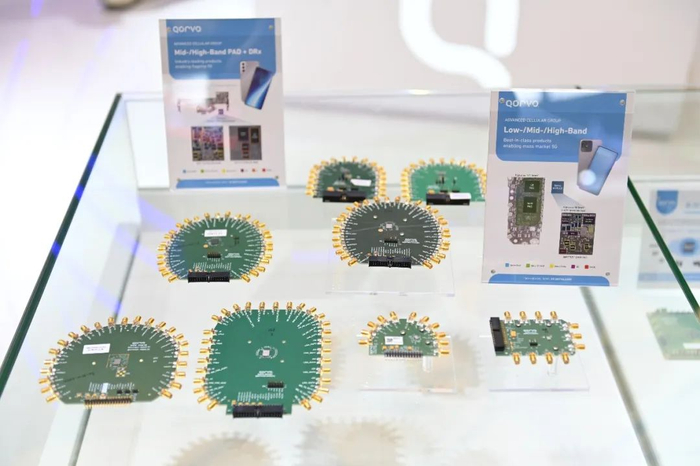 Qorvo展示了多款应用于手机的高度集成射频前端模块,通过集成功率放大器、滤波器、开关、低噪声放大器和双工器等功能,支持多频段通信,以增强设备在不同网络环境下的收发能力,并有助于减小设备尺寸。