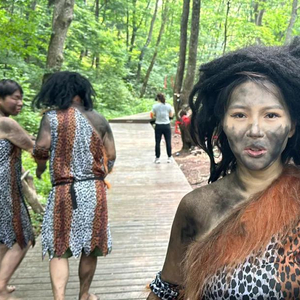 第二天,拖拖就从杭州来到关山湖。野人妆造只需要五分钟,为了更好笑,她特意取下自己的活动假牙,学着其他“野人”的样子拿着木质弓箭跟游客互动,有孩子被她吓到躲到父母身后。