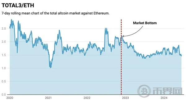 山寨币市值相对于 ETH 市值约为 1.48。自 2020 年以来,这个比例只有在少数几次情况下才会这么低,这表明 ETH 表现优于大多数山寨币。