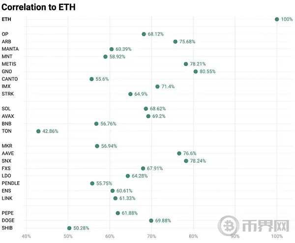下图显示了各种代币与 ETH 之间的相关性。ETH 与 ETH 之间的相关性显然是 100%。与 ETH 相关性最高的山寨币是 GNO、SNX、METIS、AAVE 和 ARB。