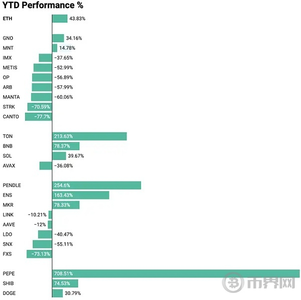 2024 年,meme 代币表现突出,这在最大的以太坊原生 meme 代币中尤为明显。Pepe 涨幅最大,上涨了 708%;SHIB 上涨 74%;DOGE 上涨 31%。