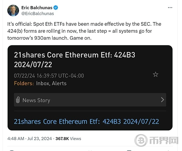 美当地时间周一,据监管文件和相关公司的公告,美国SEC正式批准了多家公司的以太坊现货ETF上市交易申请。以太坊现货ETF 正式生效,424(b) 表格正在陆续出炉,现在只等相关 ETF 在美东时间周二上午9:30(北京时间7月23日晚21:30)上市。