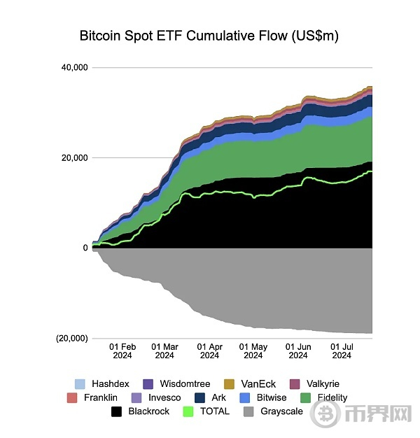 此外,ETHE就算是在短期内存在抛压和砸盘,在长期内也会被其他以太坊ETF 消化。我们从比特币现货 ETF 的流入流出动向就可以看出,尽管 GBTC 流出规模大,但截至7月22日,比特币现货ETF净流入已超170亿美元。且从价格表现来看,抛压并未对比特币价格产生过多影响。