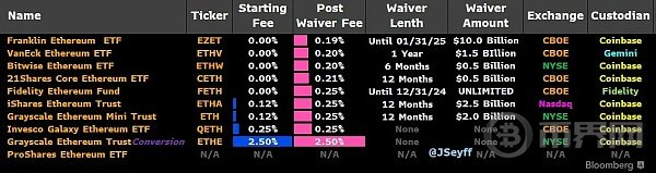 Grayscale 现货以太坊 ETF 费用为 2.5%,代码为 ETHE;