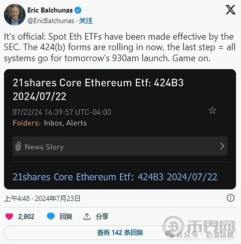 彭博ETF 分析师Eric Balchunas 今晨在X 上发文表示,以太坊现货ETF 已经正式由SEC 批准生效,明天9:30(台湾时间今晚)将正式上市交易,符合此前市场的期待。