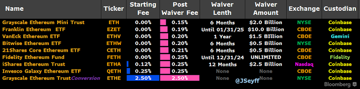 在最近的一份文件中,Grayscale透露,在转换其100亿美元的Grayscale以太坊信托(ETHE)后,它计划将其ETH ETF的费用保持在2.5%。这一数字至少比竞争对手透露的数字高出10倍。
