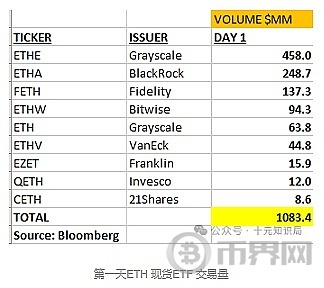 收盘后,以太坊现货ETF 第一天的总交易量为10 亿美元,是比特币现货ETF 第一天交易量的23%,彭博ETF 分析师表示: