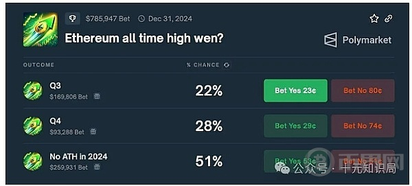 在预测市场Polymarket 上,最大的一个市场投注额接近78 万美元,其中有51% 的用户认为「2024 年ETH 不会出现ATH」;约28% 的用户预测,ETH 可能在第四季突破历史高点。